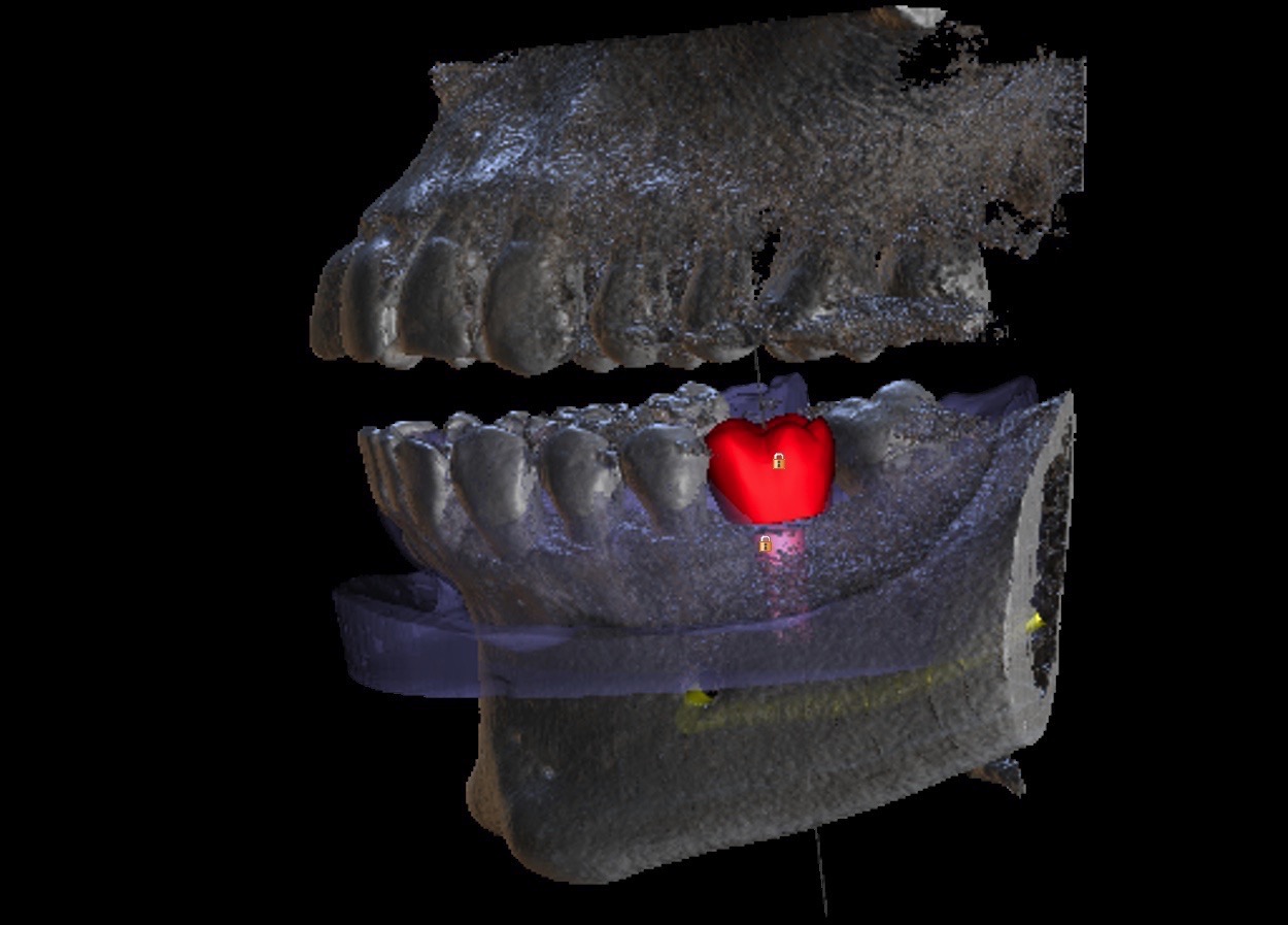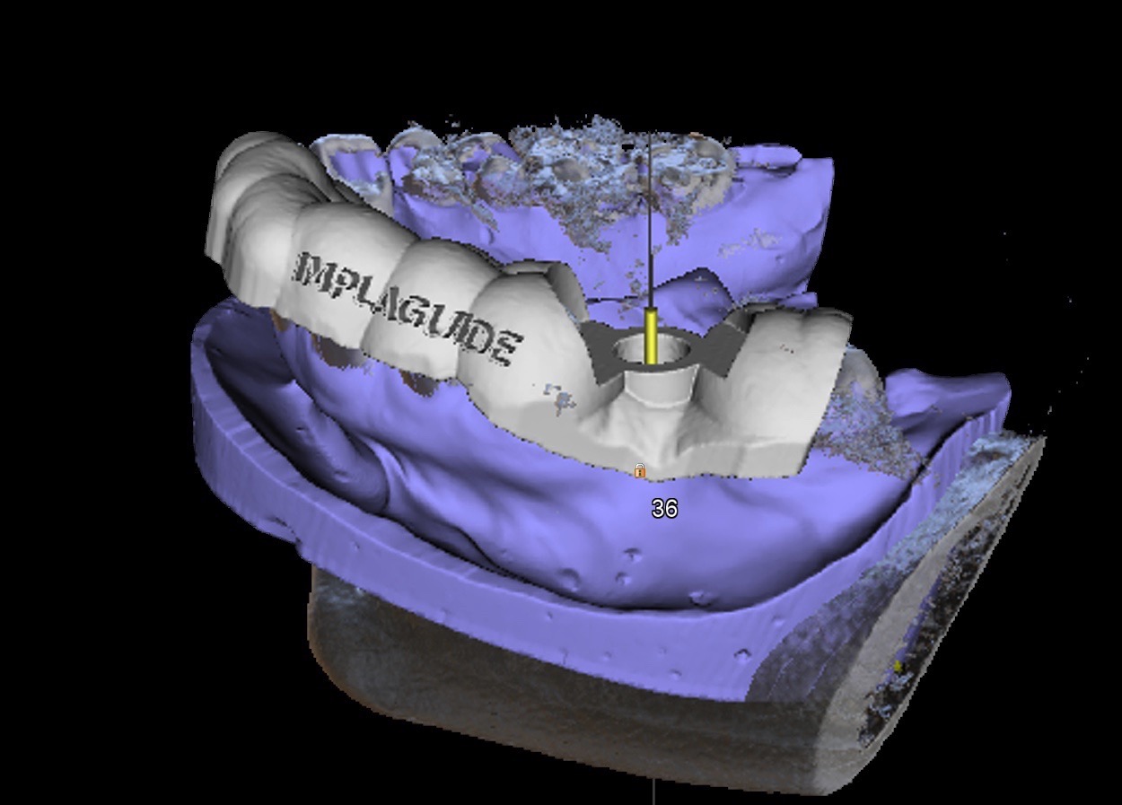 Supply us with the implant brand and size and we will position it exactly to your specifications and in relation to the virtual final tooth position. We will send a written report for you to check and note any changes if needed. We will not make the guide until you are 100% satisfied with the virtual placement. Alternatively use free software to plan the case yourself and send us the plan file and we can make the guide from that.